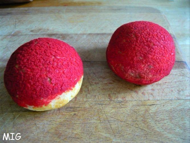 Sur une plaque à pâtisserie (idéalement perforée et recouverte d’un papier cuisson), pochez des petites boules régulières en tenant la poche à douille bien verticalement, recouvrir d’un disque de craquelin rouge, enfournez et baisser le four à 170°. C’est parti pour environ 45 mn (on surveille), sans ouvrir la porte du four.