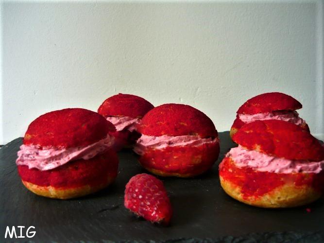 Garnissez-les de crème Chantilly à la framboise (préalablement mise dans une poche à douille), insérez une framboise entière.