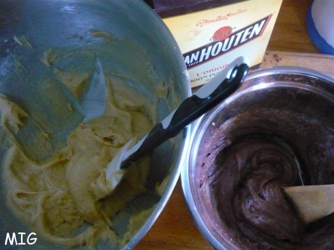 Mélangez toutes les poudres (sauf le cacao) dans un saladier, ajoutez le beurre, la crème fraîche, l’oeuf, et mixez, touillez, fouettez, selon l’ustensile utilisé, jusqu’à obtention d’une belle pâte homogène que vous diviserez en deux parts égales. Dans l’une le cacao, dans l’autre la vanille. Mélangez bien les deux.