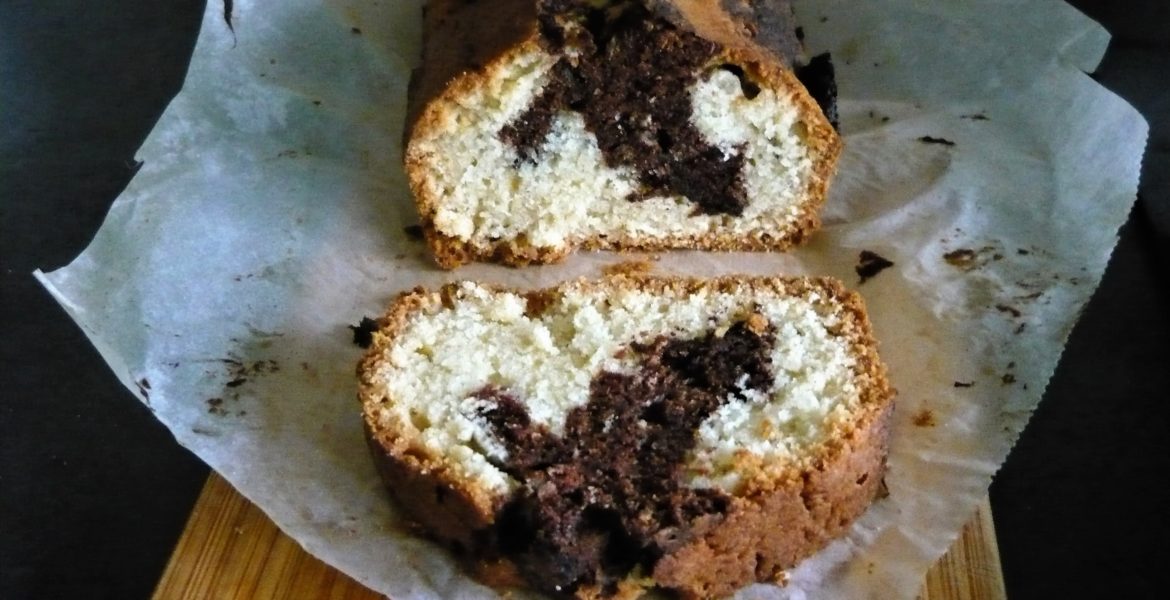 Beurrez et farinez un moule à cake, versez un peu de pâte à la vanille, recouvrez d’une couche de pâte au cacao puis terminez avec la pâte à la vanille. Lissez bien avec une spatule trempée dans l’eau froide, enfournez à 160° pour environ 40 mn. Pour ce genre de gâteau, il n’y a pas mieux que le bon vieux test de la lame du couteau piquée dedans et qui doit ressortir sèche.