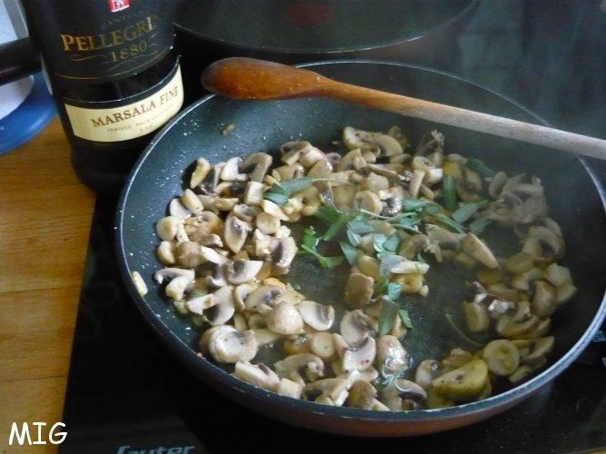 Faire revenir, dans une poêle, les champignons émincés. A mi-cuisson, ajoutez l’ail écrasé, les feuilles de sauges grossièrement déchirées, salez, poivrez puis, à la fin de la cuisson, déglacez avec le Marsala.