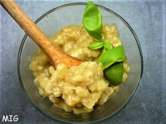 Une fois l’orge cuit, éteignez le feu et incorporez délicatement la crème d’aubergine, le beurre et le parmesan rapé, terminez par un ou deux tours de moulin à poivre.