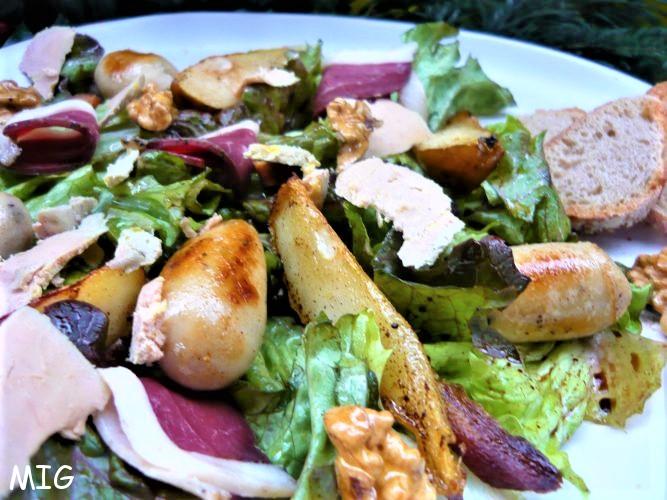 Quand vous avez obtenu le résultat souhaité, à savoir que les deux soient parfaitement dorés, posez-les sur du papier absorbant puis dressez-les sur la salade assaisonnée, ajoutez des petites tranches de magret fumé, les cerneaux de noix, éventuellement des petites lamelles de foie gras, les lamelles d’abricots secs. Servez avec du pain toasté et accompagnez, avec modération, d’un Bergerac rouge ou blanc moelleux.