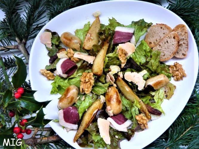 Et si pour se remettre du marathon-cadeaux-cogitage-menus-de-réveillons, on se faisait une petite salade genre « on va trop bouffer pendant les fêtes… » mais super gourmande parce que hein…..la verdure toute seule ça ne va pas nous aider à tenir, à ce rythme jusqu’au 24 !!! et de toute façon, les bons boudins blancs en dehors de décembre, y a pas.