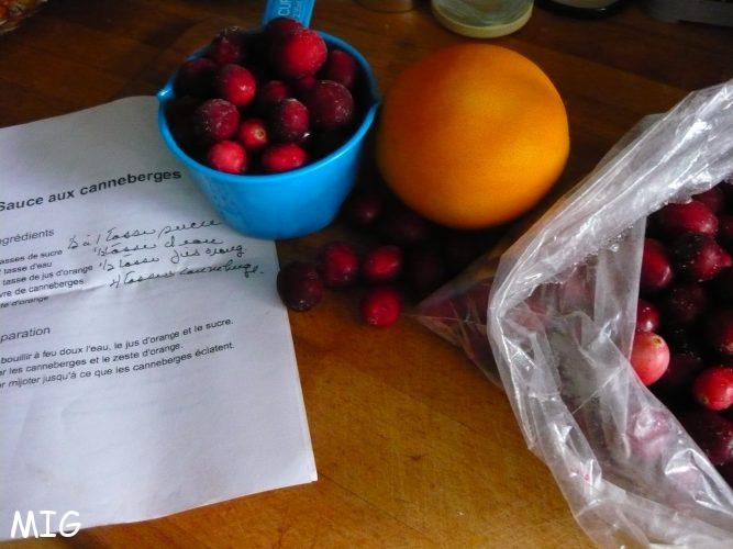 Faites bouillir à feu doux l’eau, le jus d’orange et le sucre. Ajoutez les canneberges et le zeste d’orange.