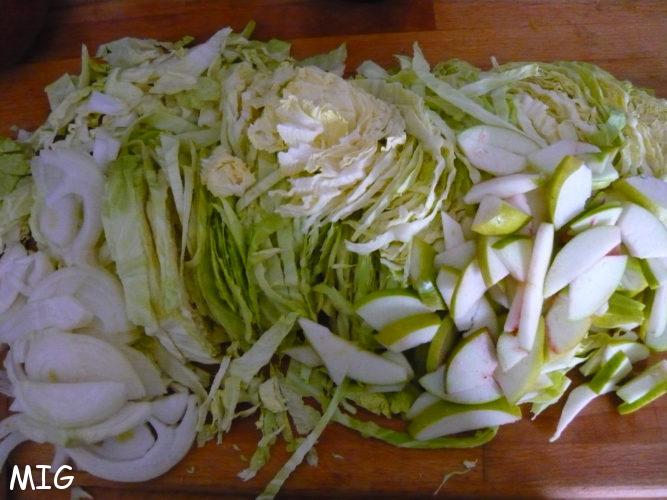 Epluchez et émincez finement, comme sur la photo, choux, pommes, oignon.