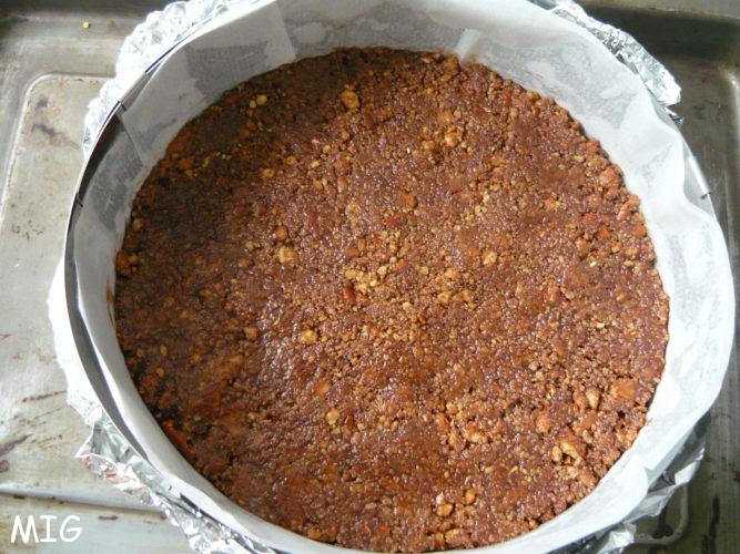 Emiettez les biscuits, soit au robot, soit dans un sac à surgelés et vous les massacrez au rouleau à pâtisserie. Ca détend. Transvasez dans un saladier et mélangez avec les noix hachées, le cacao, le sucre puis le beurre fondu et tapissez le fond du moule avec ce mélange en terminant avec le dos d’une cuillère pour bien lisser. Réservez au frais, sur la plaque à pâtisserie si vous utilisez un cercle.