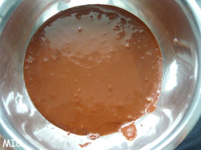 Faites fondre le chocolat blanc au bain-marie en prenant garde à ce que le fond du récipient ne touche pas l’eau et en remuant régulièrement.