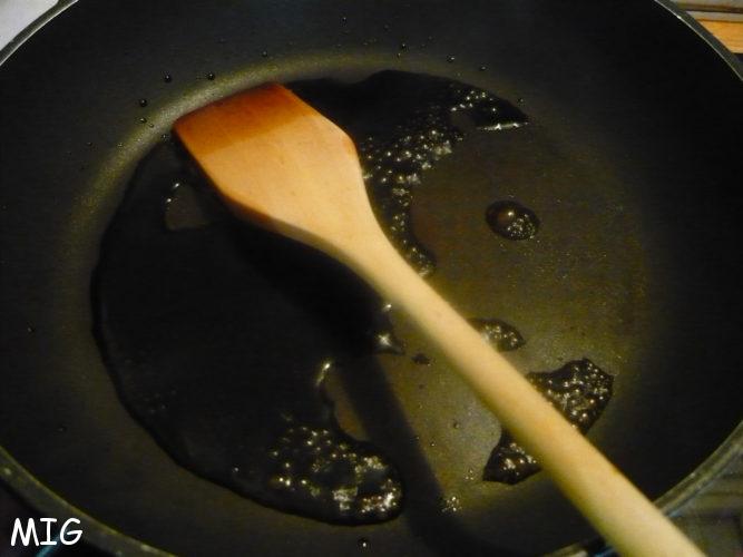Faites chauffer la poêle à feu vif, versez le vinaigre et laissez-le bouillir et s’évaporer, en partie, en décollant les sucs du chorizo à l’aide d’une spatule (on dit « déglacer la poêle »).