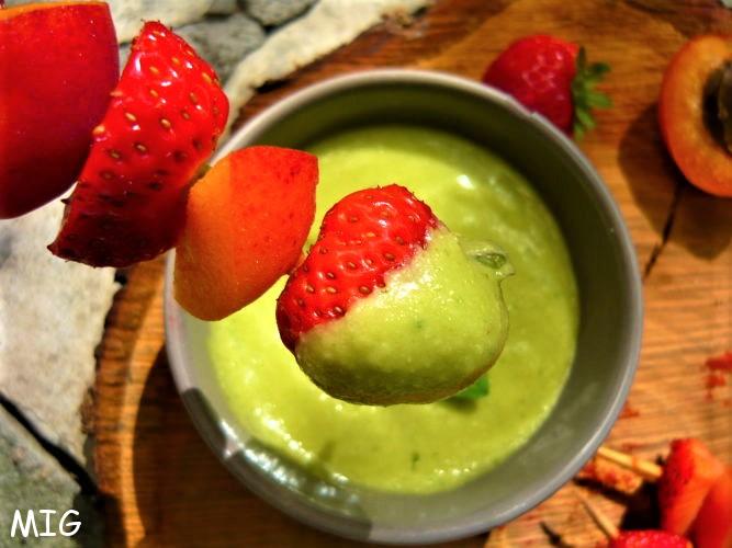 Un pesto sucré ? meeeuh non c’est pas pour les linguine (quoi que, je connais un dessert portugais, avec du vermicelle, qui est une tuerie, donc si ça vous inspire, je veux bien votre retour), mais pour tremper les fruits d’été tels que fraises, abricots, pêches, nectarines et finir un repas sur une touche légère mais gourmande (et vite fait, sans cuisson).