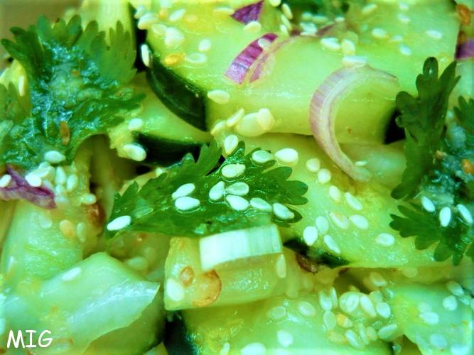 Epluchez les concombres et émincez-les (j’ai pris des bio donc je ne les ai pas épluchés complètement), saupoudrez avec les graines de coriandre (je les ai un peu écrasées dans le mortier) et des graines de sésame (comme les miennes n’étaient pas grillées, à la base, je les ai torréfiées trois fois trente secondes au micro-ondes).