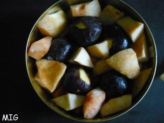 Lavez, essuyez et ôtez les queues des figues, ne les coupez surtout pas, on les laisse entières pour qu’elles ne coulent pas et que leur cuisson soit raccord avec celle des morceaux de coings.
