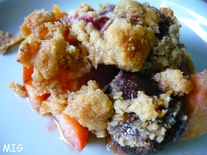 Répartissez tous les fruits dans le plat, puis la pâte à crumble sur les fruits et enfournez pour environ 45 mn (tout dépend des fours).
