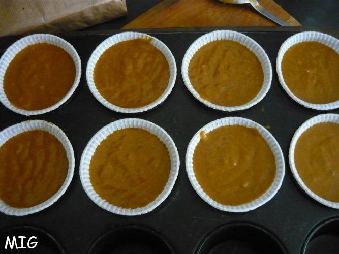Versez dans des moules à muffins garnis de caissettes et enfournez pour environ 25 mn à 180°. Comme toujours, testez avec la pointe d’un couteau qui doit ressortir sèche.