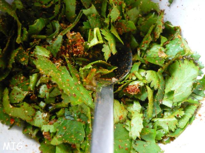 Mélangez, dans un bol, la coriandre fraiche ciselée (gardez en un peu pour la déco), l’ail haché, les épices.