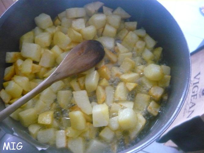 Faîtes chauffer deux cuillerées à soupe d’huile dans la sauteuse, à feu moyen, ajoutez le mélange coriandre-ail-épices et laissez cuire environ 30 secondes (pour faire sortir les arômes) avant d’ajouter les pommes de terre, le jus de citron, coupez le feu, mélangez bien.