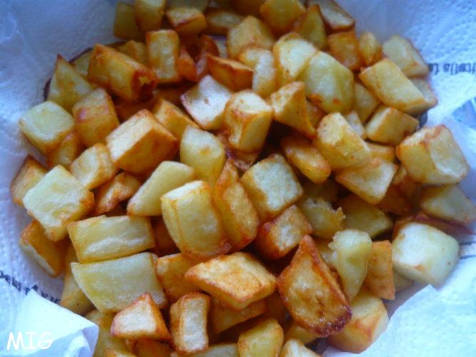 Faîtes chauffer l’huile à 180° (testez avec un dé de pomme de terre, c’est bon quand ça frémit bien tout autour) et faîtes frire les pommes de terre, en remuant régulièrement, jusqu’à ce qu’elles soient bien dorées et croustillantes.