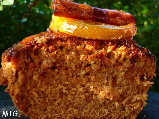 Placez le cake sorti du four sur une grille, arrosez-le du jus d’orange et terminez avec les rondelles d’orange confites.