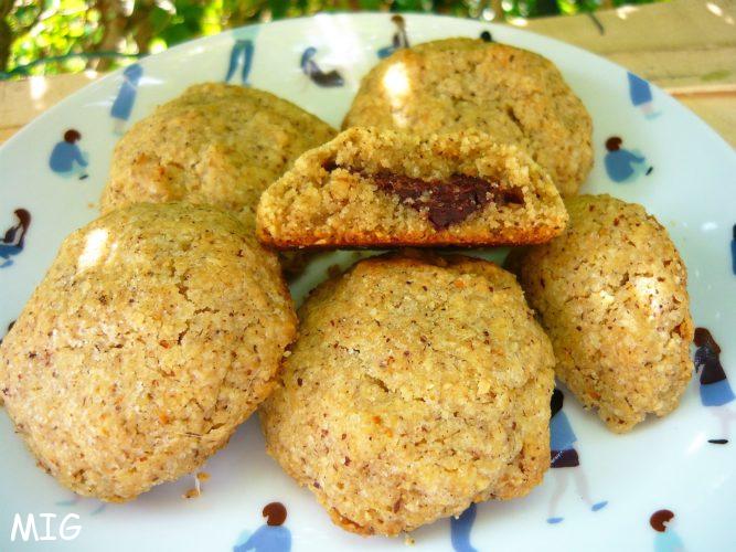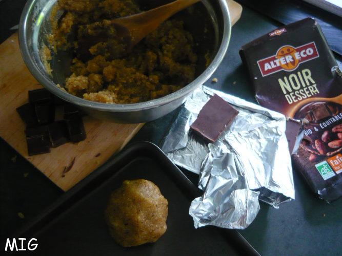 Mélangez les poudres, ajoutez le beurre fondu et les jaunes d’oeuf, façonnez des petites boules au centre desquelles vous incorporerez un carré de chocolat. Aplatissez-les légèrement avant de les disposer sur une plaque à pâtisserie.