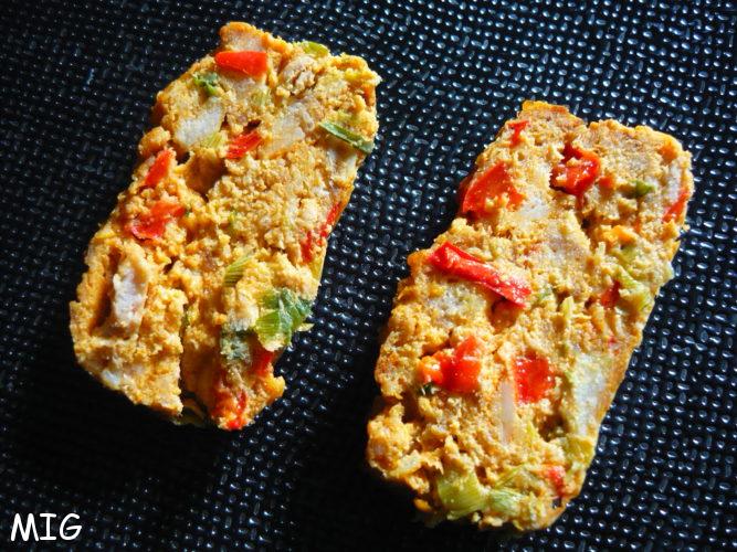 Je propose cette recette avec du thon, du poivron revenus à l’huile d’olive et des tiges d’oignons frais, mais vous pouvez vous amuser avec des sardines, un zeste de citron vert, d’autres herbes, une courgettes râpée crue, du jambon, des lardons, du fromage rapé, d’autres épices, bref, utilisez-la comme une base et amusez-vous (ne mettez quand même pas tous les ingrédients cités dans le même pain), on est dans la « cuisine du placard », ouvrez le vôtre.