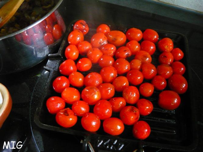 Dans un saladier, mélangez bien les tomates cerises entières avec l’huile d’olive. Faites chauffer un grill à feu vif. Lorsqu’il est très chaud, faites saisir les tomates cerises, en les retournant plusieurs fois pour qu’elles se « marquent », elles ne doivent pas éclater donc, dès qu’elles sont bien marquées, réservez-les dans une assiette.