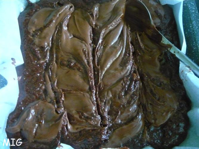 Quand tout est parfaitement homogène, versez dans le moule, lissez avec un couteau et terminez en étalant le reste de la pâte à tartiner ; avec un couteau ou d’une cuillère faites des stries profondes pour en faire pénétrer dans le brownie. Incorporez ensuite les noisettes (préalablement torréfiées 4 x 30 secondes au micro-ondes en remuant entre chaque étape)  en les répartissant bien.