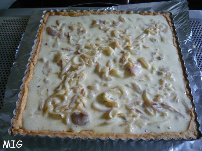 Dans un bol, mélangez la crème fraîche, les oeufs, incorporez les oignons (sans le laurier), goutez et rectifiez l’assaisonnement si besoin (attention ça se renforce à la cuisson).