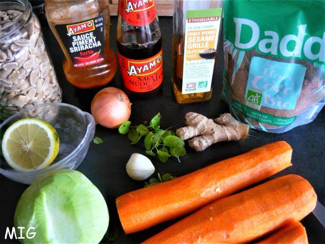 Dans un saladier, mélangez dans cet ordre : le jus de citron, le sucre, le nuoc mam, le gingembre et la gousse d’ail hachés, l’huile de sésame, l’oignon, la coriandre ou la menthe. Ajoutez les carottes et le chou rave râpés. Goutez, ajustez l’assaisonnement si besoin et terminez avec les cacahuètes grossièrement concassées.