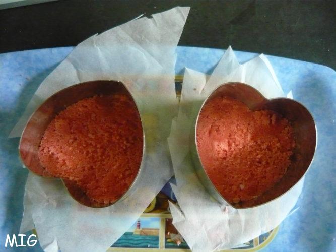 Réduire les biscuits en poudre, incorporez ensuite le beurre fondu, mélangez bien et répartissez au fond des deux coeurs (ou cercles), tassez avec le dos d’une cuillère pour avoir une base bien régulière.