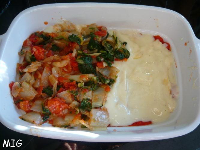 Versez un peu de béchamel et lissez-la jusqu’à ne plus voir les plaques, ensuite une couche de blettes, une autre de lasagnes et recommencez jusqu’à épuisement des ingrédients en terminant par les plaques de lasagnes. Versez un peu d’eau dans les boîtes de pulpe (j’avais un tout petit peu de blettes que j’ai mises avec), arrosez la surface des lasagnes. Terminez avec un filet d’huile d’olive et du parmesan ou de la mozzarella selon ce que vous avez.