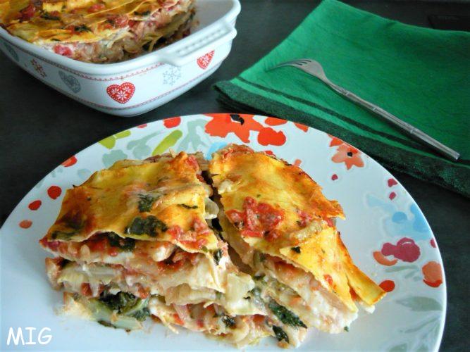 Lorsque j’ai fait la Tourte aux Blettes, qui ne requiert que les feuilles, ne sachant pas trop quoi faire des côtes, j’ai fini par improviser des lasagnes, avec ce que j’avais sous la main, et comme toujours, quand le test se révèle positif, la publication ici finit par arriver.