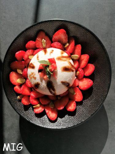 Dans chaque assiette, posez une boule de burrata sur le financier, répartissez les fraises autour, les pistaches torréfiées (3×30 secondes au micro-ondes en les remuant entre chaque étape), puis concassées.