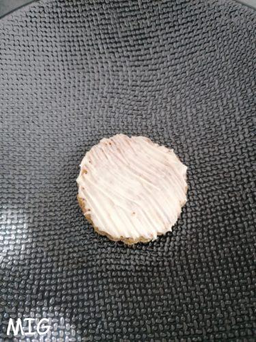 Versez sur une plaque à pâtisserie tapissée d’un papier sulfurisé beurré ou sur une plaque à génoise en silicone et enfournez pour 5 mn à 240° puis encore 5 mn à 200°. Stoppez le four et attendez encore 5 mn avant de sortir et démouler.