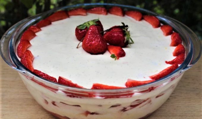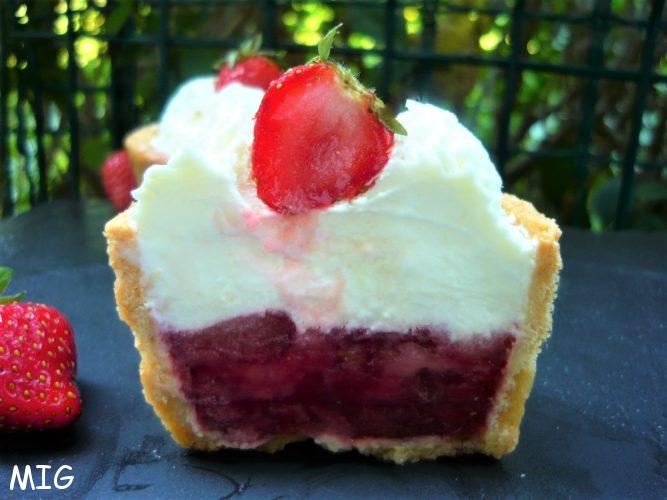 Ca faisait longtemps que j’avais envie de faire une version un peu haute, comme un petit gobelet, de ce qui est, finalement, une tarte aux fraises puisque sous la Chantilly se cache une gelée de fraises surmontée d’une couche de fines lamelles de fruits crus. Selon ce que vous avez, moule ou cercle, vous pouvez faire cette recette pour une tarte ou des tartelettes. Vous allez voir, c’est aussi facile que bon.