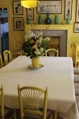 Quand on fait, dans une grande et belle cuisine, de magnifiques repas pour de nombreux convives, la suite logique, c’est une grande salle à manger et, quand on est un peintre, la couleur et la lumière sont très importantes. Le jaune a donc été choisi, pour les murs, mais plus audacieux pour l’époque, pour les meubles, afin d’illuminer la pièce et servir d’écrin à une grande partie de la collection d’estampes japonaises (il y en a en tout 211 visibles dans la maison, sur les 241 de la collection).