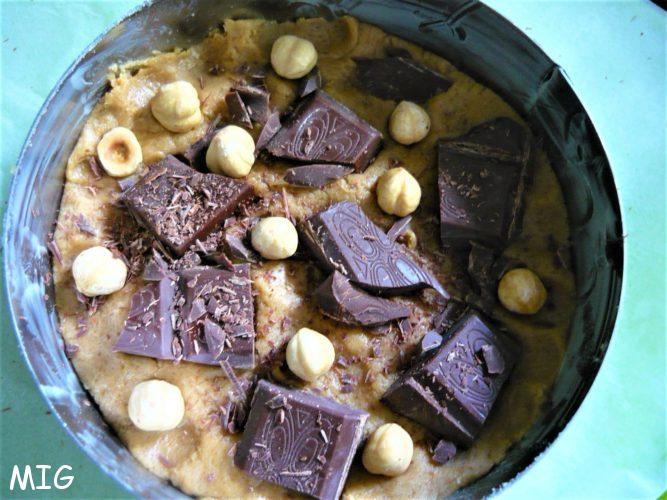 Tapissez le fond du cercle avec la première abaisse de pâte avant d’y répartir le chocolat et les noisettes, comme sur la photo :