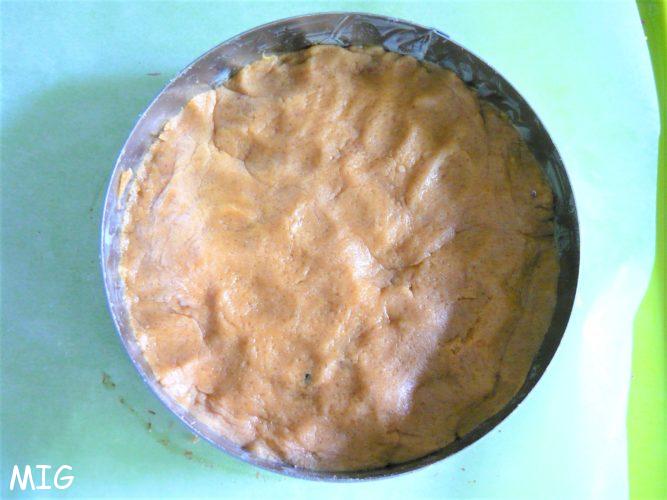 Pour le réaliser, j’ai utilisé un cercle de 16 cm de diamètre sur 9 de haut. Ceux qui me suivent se rappelleront peut-être que c’est, en fait, une boîte de confit de canard sans les fonds (qui me sert aussi pour les cheesecakes). Si vous n’avez pas ça sous la main, prenez un moule, cercle ou cadre de 16, 18 ou 20 cm, bien beurré.