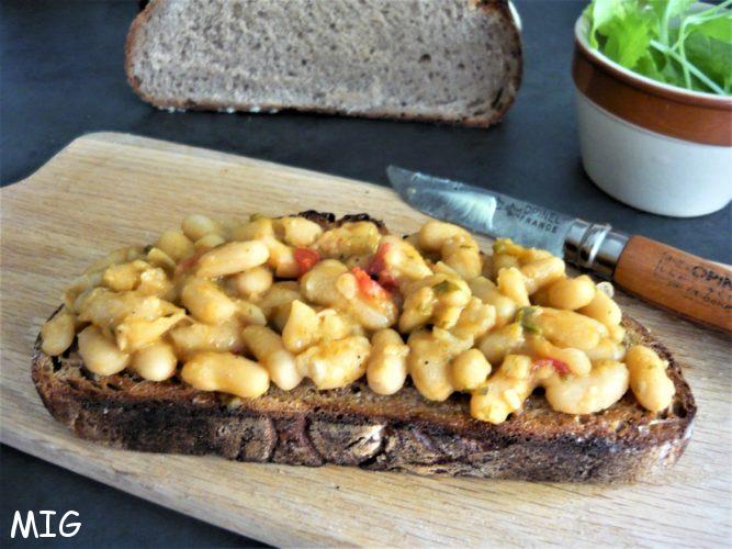 Toastez des tranches de pain, frottez-les à l’ail avant de les tartiner (légèrement, je vous vois venir là…) de beurre, terminez avec une couche généreuse de mogettes (prenez garde à ne pas verser de jus pour que la tartine ne soit pas détrempée) et dégustez avec un Fief Vendéen (et modération).