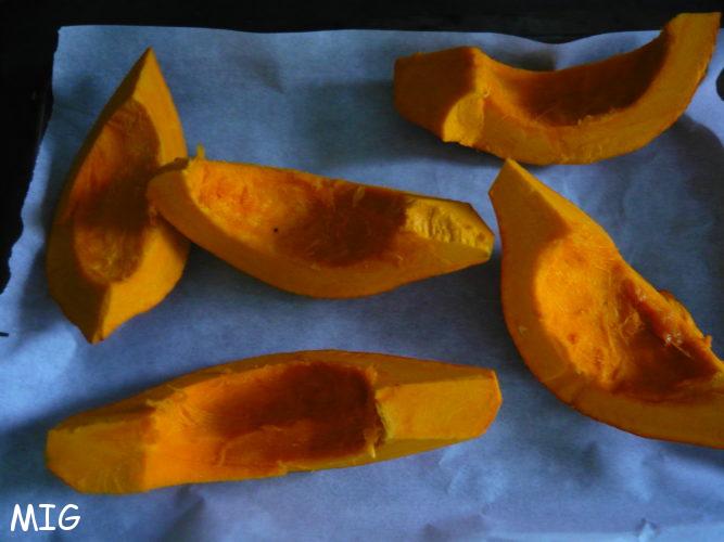 Pendant ce temps, préparez le potimarron comme sur la photo, sans l’éplucher (c’est pénible et risqué d’éplucher un potimarron cru) et enfournez-le à 180° jusqu’à ce qu’il soit parfaitement tendre.