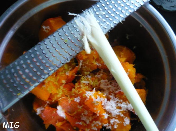 Dans un saladier, mixez ensemble (au mixeur plongeant) : le potimarron, le jus du citron et le zeste d’une moitié, la citronnelle et le gingembre hachés (si vous avez une Microplane…), salez, goûtez et rectifiez l’assaisonnement si besoin mais n’oubliez pas que tous les goûts vont se révéler au frigo.
