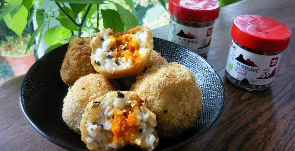 Lorsqu’on m’a proposé, pour un concours organisé par Lima, de relever le défi d’une recette vegan ou végétarienne, à base de leur(s) Furikake, condiment japonais traditionnel à base d’algues dont on saupoudre le riz, l’idée des arancini italiens, très proches des onigri japonais s’est aussitôt imposée. Ils sont parfaits pour les lunch boxes/bento mais vous accompagneront aussi parfaitement en promenade, pique-nique et voyages. A la découpe, je leur ai trouvé un petit air des très écossais Scottish Eggs, ce que je n’avais pas prévu.