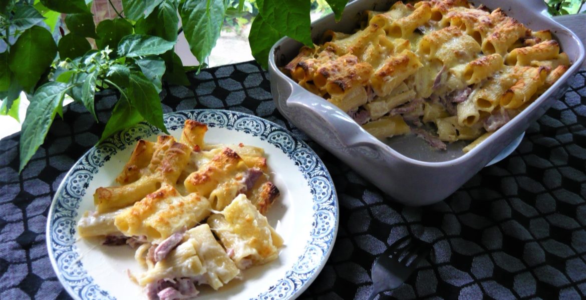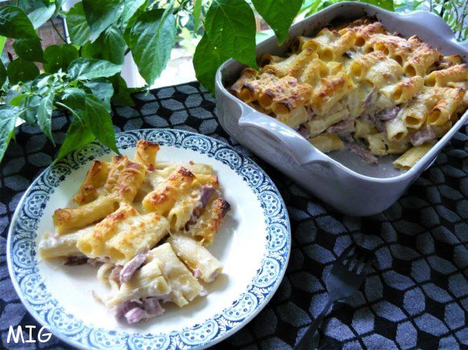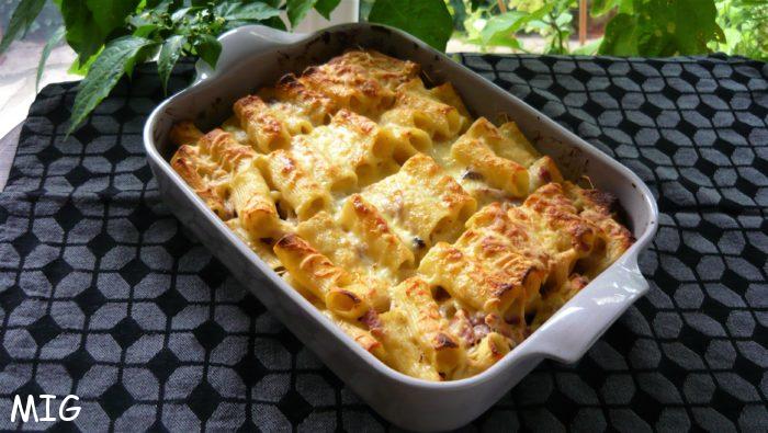 Je donne les quantités pour un paquet de 500 g de Rigatoni (mon plat mesure 28 x 22 x 7, cm) ce qui fait entre 4 et 6 personnes selon l’appétit.