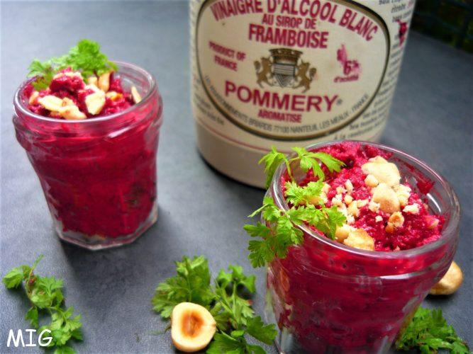 Ca faisait un moment que j’avais envie de tester ce vinaigre, produit chez moi, en Seine et Marne, mais je n’imaginais pas à quel point ça fonctionnerait avec de la betterave. L’association des deux est tellement parfaite que je ne me vois plus en utiliser un autre avec ce légume. Il s’agit d’un vinaigre au sirop de framboise, à peine sucré et très parfumé.
