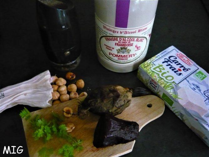 3 cuillerées à café de vinaigre à la framboise (« Les Assaisonnements Briards » pour moi)