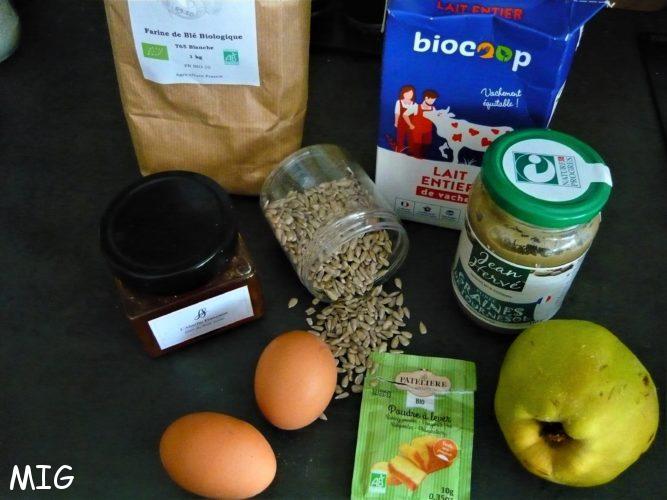 Fouettez ensemble la purée de graines de tournesol, le miel, les jaunes d’oeufs, le lait jusqu’à ce que la consistance soit homogène, incorporez la farine et la levure préalablement mélangées, le coing grossièrement râpé