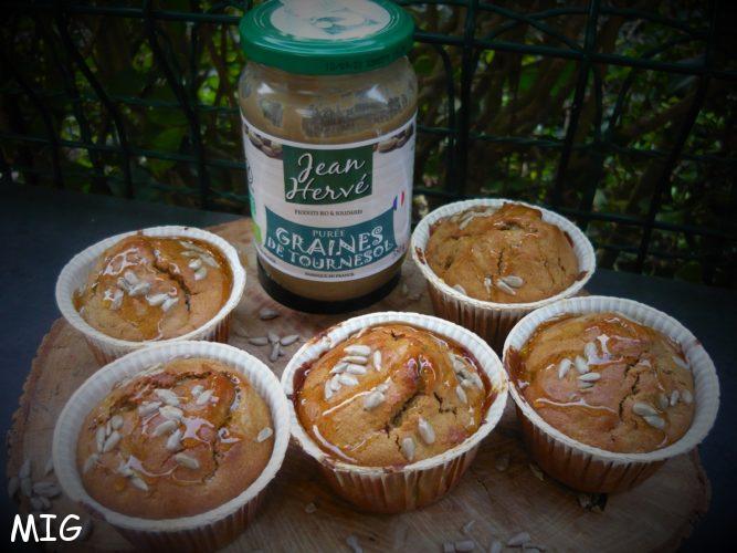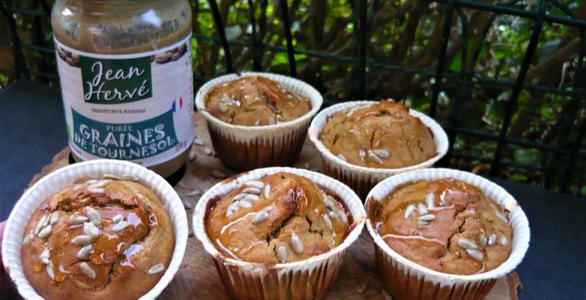 Lorsque j’ai été mise au défi, pour la marque de fruits secs (et dérivés) bio Jean Hervé, que je consomme régulièrement, de créer une recette avec la Purée de Graines de Tournesol, j’ai su tout de suite que je l’utiliserais à la place du beurre dans une pâtisserie, sucrée ou salée, et puis, mon regard s’est posé sur le miel, le coing qui trainait (dans un coin mouuuhaaa) et comme j’avais aussi des graines de tournesol (d’où le « s » à tournesol dans le titre) dans le coin du coing, l’idée des Muffins aux Tournesols, Coing et Miel s’est vite imposée.