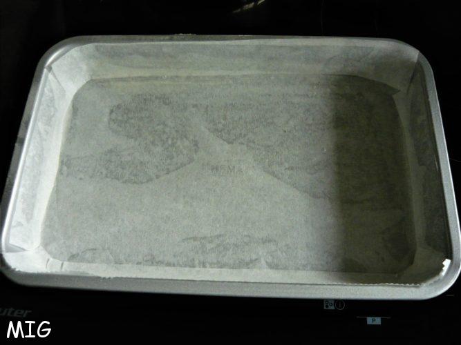 Graissez le moule, tapissez-le, fond et bords, de papier cuisson :