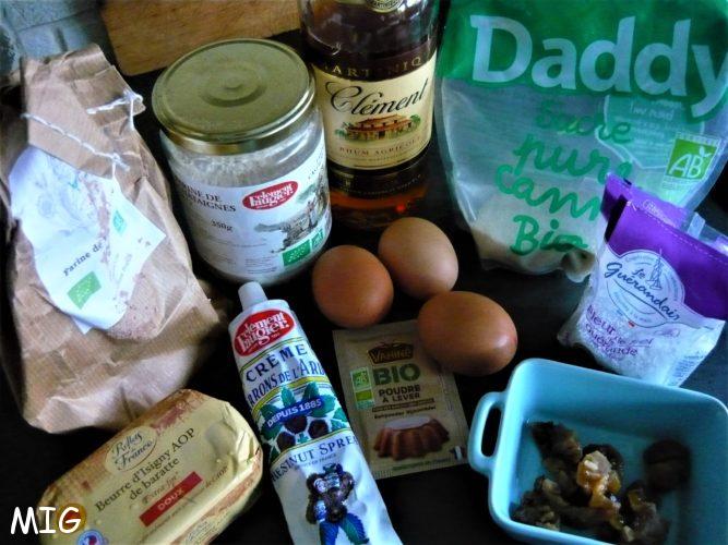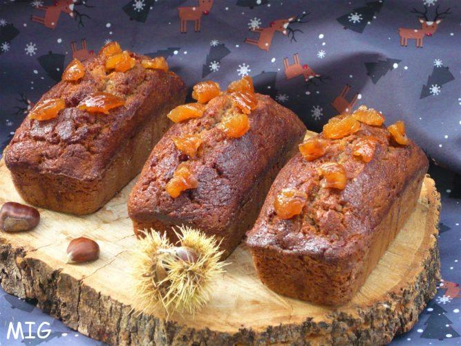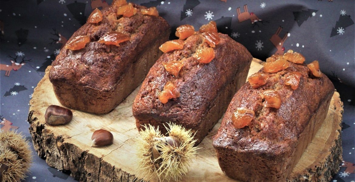 Je n’ai rien changé à la recette, j’ai juste fait un peu macérer les marrons glacés, utilisés pour les 90 g de brisures de marrons confits, une petite heure dans du rhum ; rhum que j’ai ensuite utilisé pour faire le sirop. Si le chef répartit sa préparation dans deux moules à cake, j’en ai utilisé trois de 13 x 6 cm. Selon la taille du ou des moules que vous utiliserez, le temps de cuisson sera à ajuster et, de toute façon, il est toujours approximatif et rien ne vaut le bon vieux test de la lame du couteau qu’on plante dans la partie la plus haute du cake et qui doit ressortir sèche.