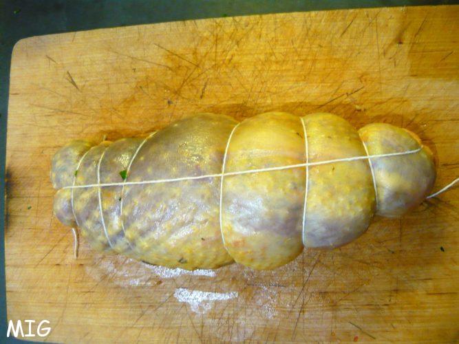 Rabattez les bords de façon hermétique et ficelez. Je n’ai absolument pas le talent d’un boucher pro (vous avez déjà vu la rapidité quand il ficèlent un rôti ?), donc j’ai fait (comme j’ai pu), plusieurs fois dans le sens de la largeur et une dans la longueur.