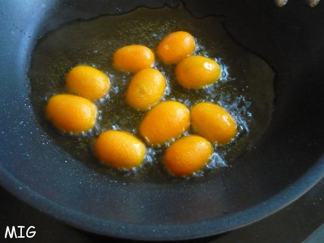Coupez les kumquats en deux, dans le sens de la longueur et ôtez les pépins, épluchez l’oignon, coupez-le en rondelles fines et, avec le doigt, appuyez pour faire des anneaux). Dans l’huile d’olive, à feu vif (6/10 pour moi), saisissez les kumquats sur la face coupée.